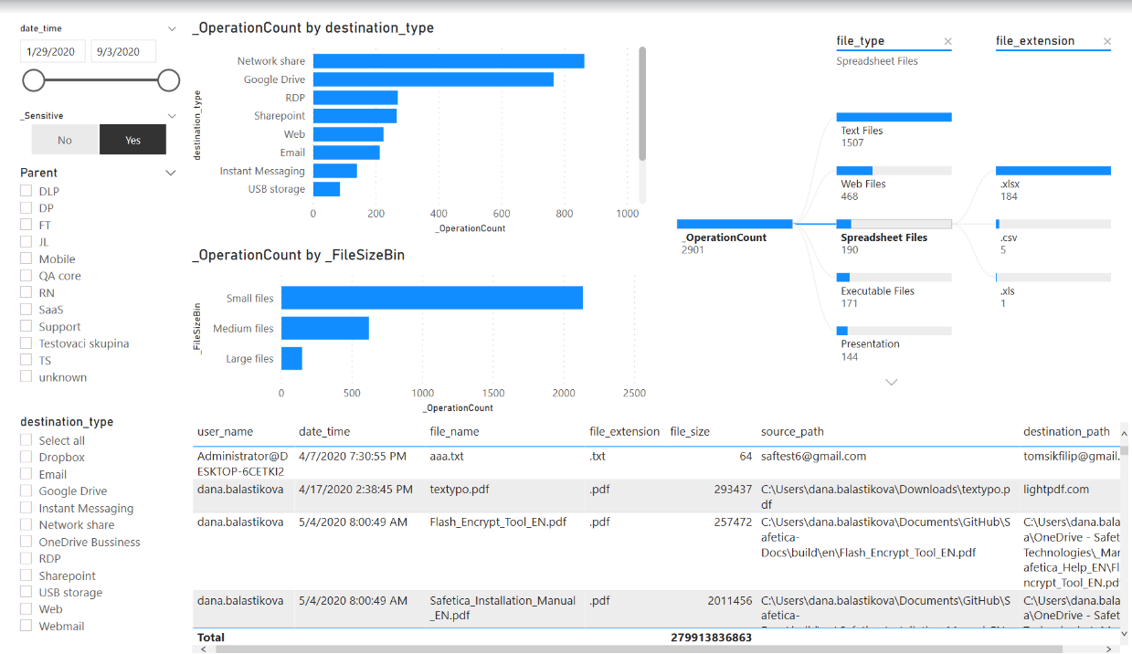 - Dataflow - możesz zobaczyć, które pliki i gdzie opuszczają środowisko (RDP, Web, E-mail, IM, USB, itp.), a także ich rozmiary. Możesz filtrować zakres czasu, poszczególne kanały i typy plików. Możesz także przełączać się między wyświetlaniem wszystkich plików lub tylko plików wrażliwych (tj. plików, które mają przypisaną kategorię danych)