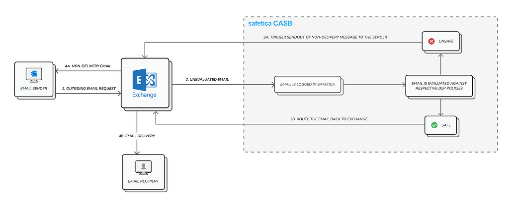 Najpierw należy aktywować nową technologię w konsoli zarządzającej Safetica. Następnie trzeba przejść do Centrum administracyjnego programu Exchange i przesłać komunikację e-mail do Safetica. Dla określony użytkowników możesz utworzyć wyjątki od reguły związane z przesyłaniem poczty e-mail.