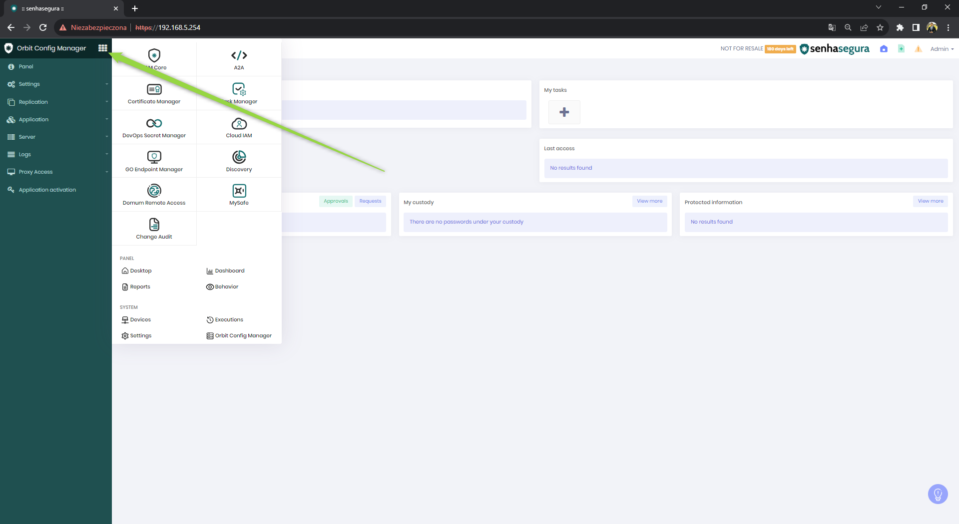 W przypadku, gdyby po kliknięciu w ikonę “9 kafelek” nie pojawiły się elementy z modułami, należy zamknąć przeglądarkę i w maszynie wirtualnej ponownie wykonać poniższe kroki, tożsame z tymi, kiedy chcemy po prostu zaaktualizować Senhasegura.